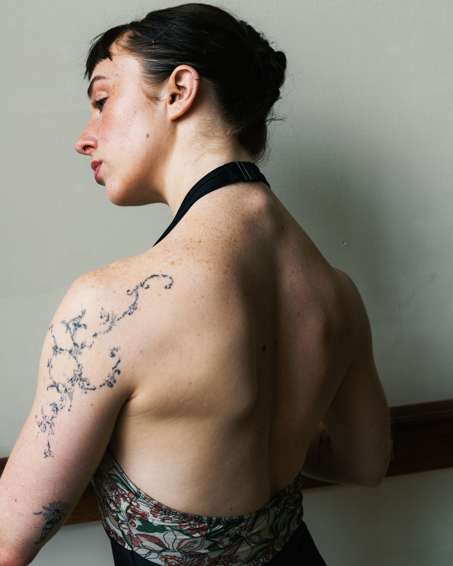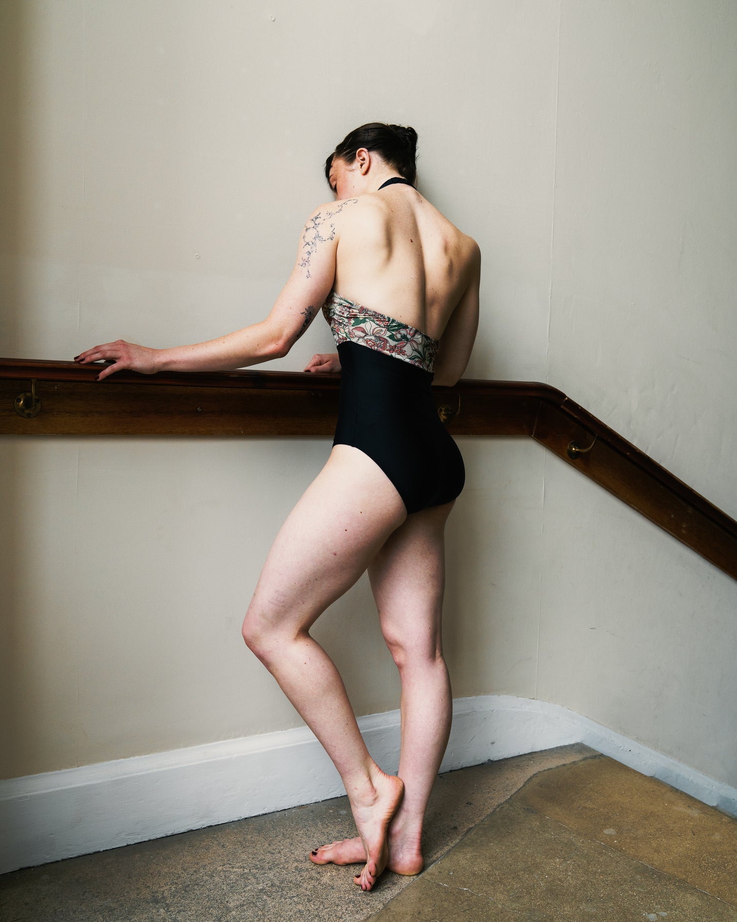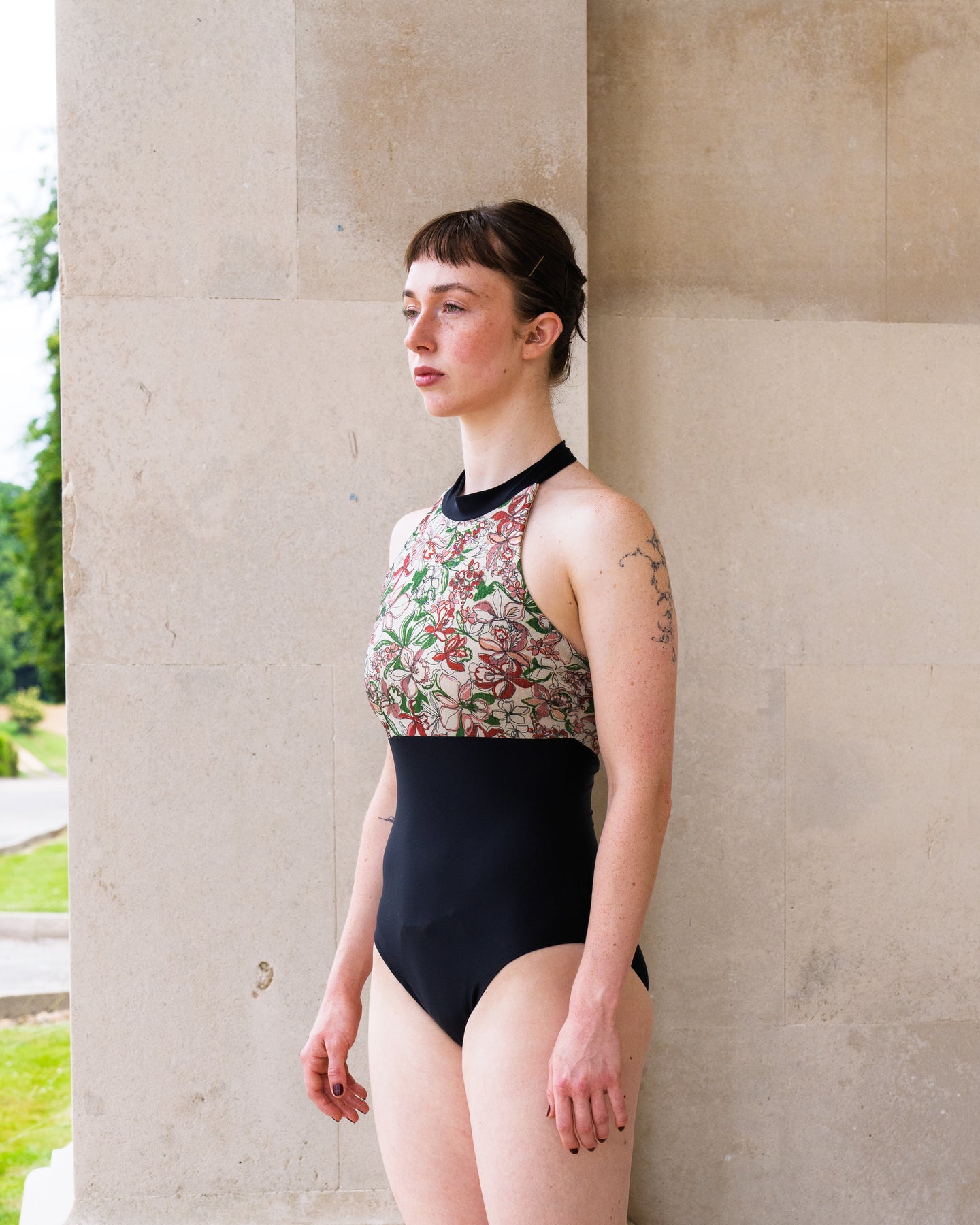 Leotard scollo all'americana fantasia e contrasti nero sul collo e nella parte inferiore.