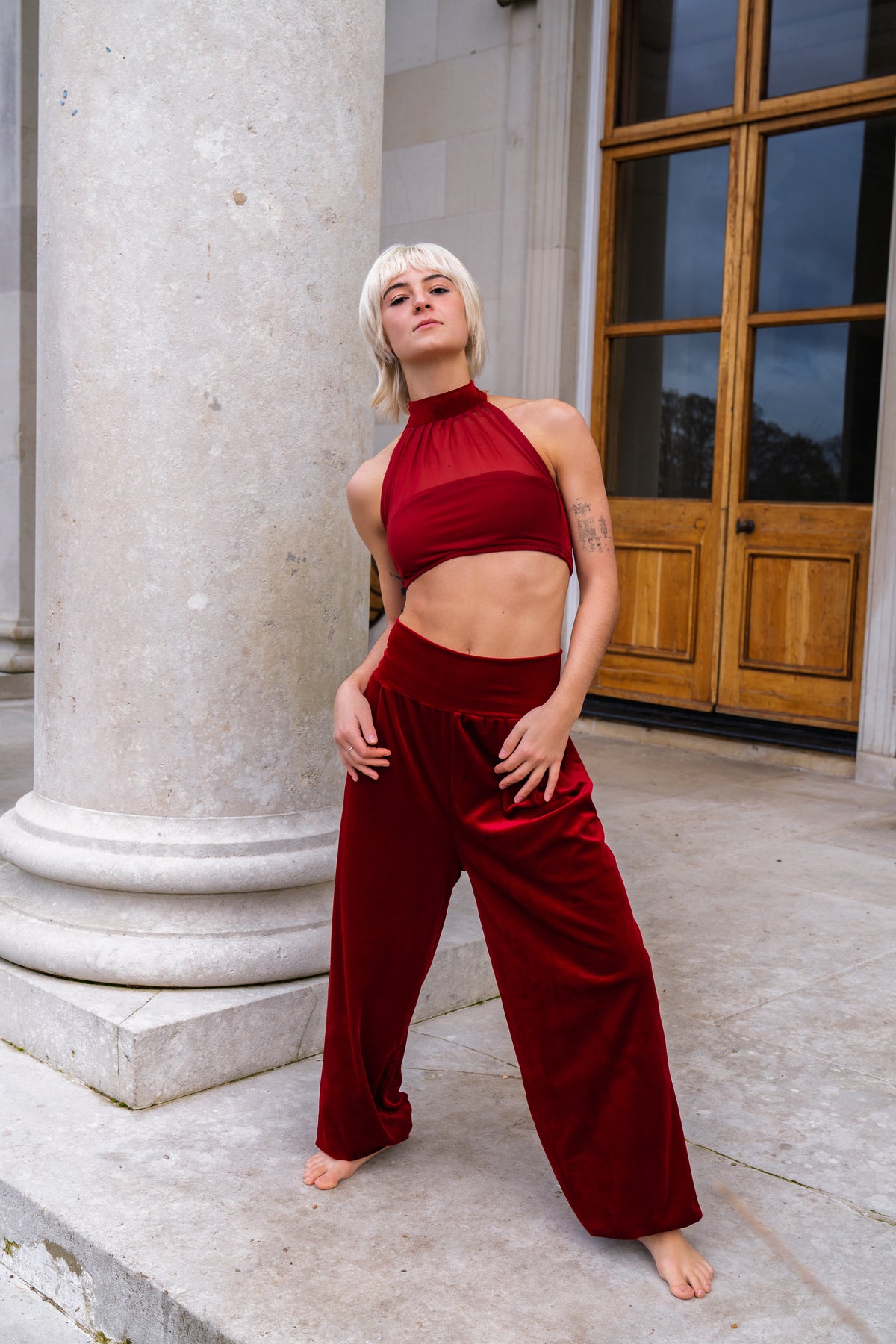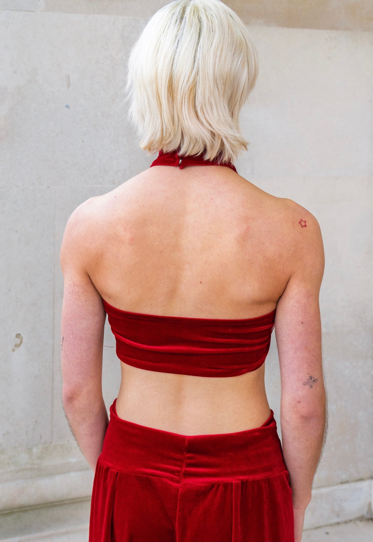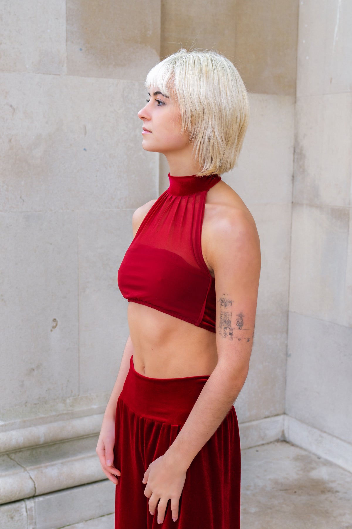 Crafted in a powerful red, this halterneck top features a delicate mesh overlay that adds depth and refinement.